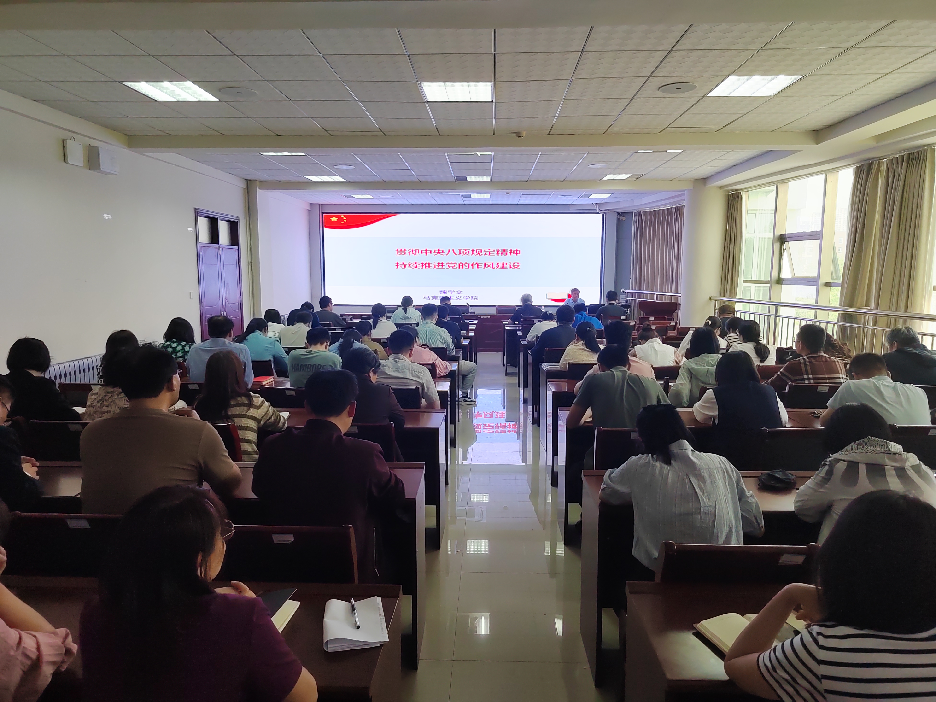 魏学文以《贯彻中央八项规定精神,持续推进党的作风建设》为题作专题辅导,从中央八项规定提出的背景与精神内涵、贯彻中央八项规定精神取得的成效、深入贯彻中央八项规定精神的重大意义和深入贯彻中央八项规定精神的具体要求等四个方面做了全面深入细致的讲解,为全体教师准确领会习近平总书记关于加强党的作风建设的重要论述,推动作风建设常态化长效化,以优良作风保障高质量发展提供了有力指导。